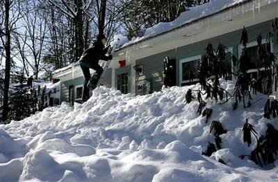 Wolfboro, N.H. resident, Natasha Rogers, comes down from shoveling several feet of snow off of her roof in preparation for the upcoming storm, Friday Feb. 29, 2008. Maine and northern New Hampshire are expecting to get up to a foot of snow. [Agencies]