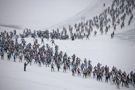 An aerial view shows cross-country skiers climbing a hill during the Engadin Ski Marathon near Sils March 9, 2008. More than 10500 skiers participated in the 42.2 km race between Maloja and S-Chanf near the Swiss mountain resort of St. Moritz. [Agencies]