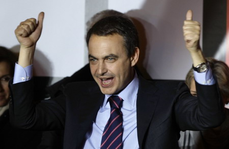 Spain's Prime Minister Jose Luis Rodriguez Zapatero gestures to supporters outside the Socialists' party headquarters in Madrid March 9, 2008. Spain's governing Socialist Party claimed victory in Sunday's election but appeared set to fall short of an absolute majority, which analysts said could delay reforms needed to cushion an economic slowdown. [Agencies]