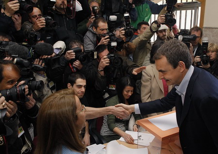 Spanish Prime Minister Jose Luis Rodriguez Zapatero (R) shakes hands with electoral staff after casting his ballot during Spain's general elections in Madrid March 9, 2008. [Agencies]