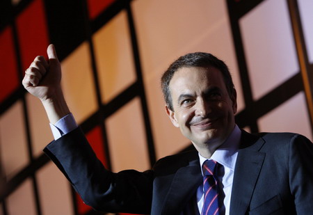 Spain's Prime Minister Jose Luis Rodriguez Zapatero gestures to supporters outside the Socialists party headquarters in Madrid, March 9, 2008. Spain's governing Socialist Party claimed victory in Sunday's election but appeared set to fall short of an absolute majority, which analysts said could delay reforms needed to cushion an economic slowdown. [Agencies]