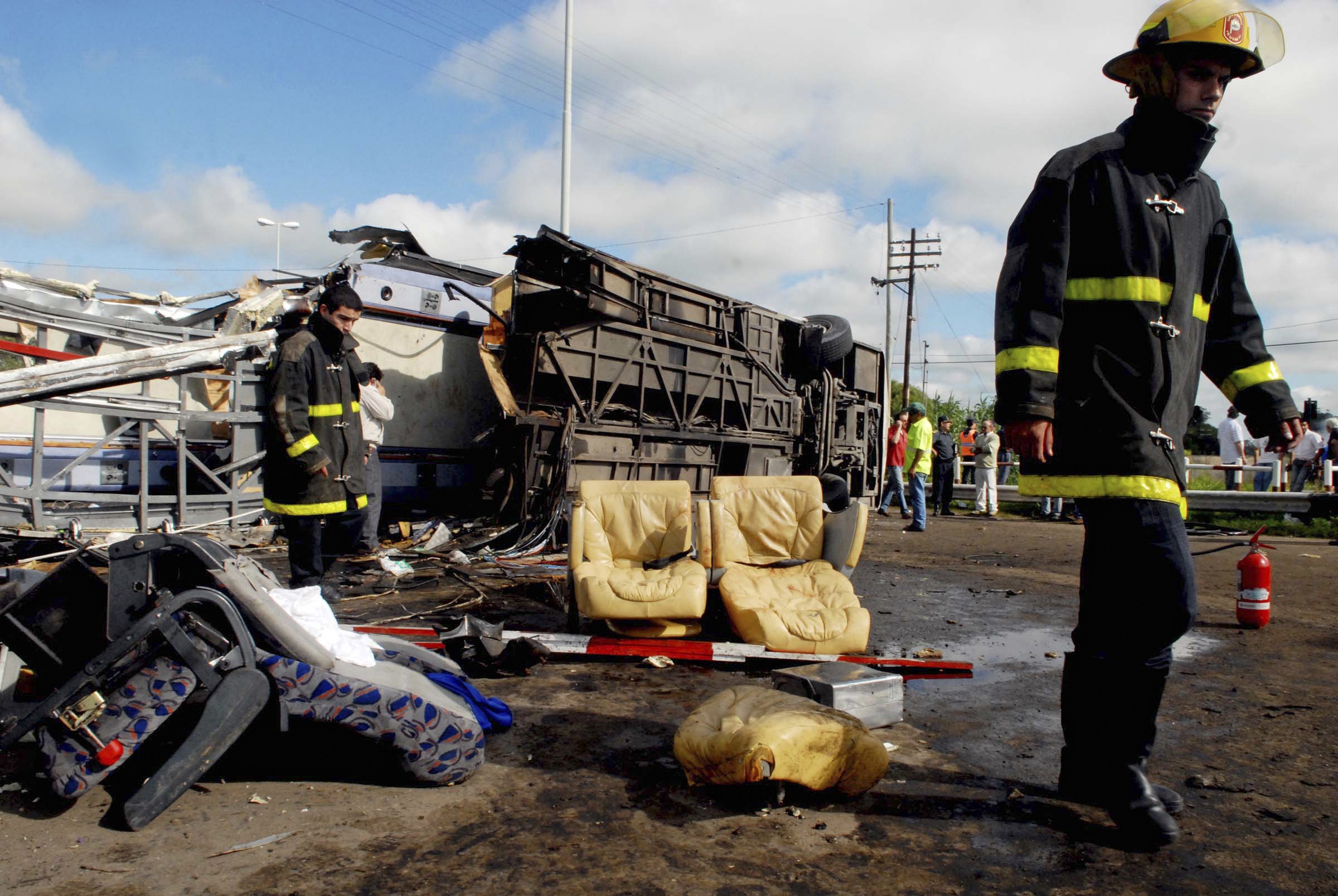 Firemen walk near the rail crossing where a passenger train crashed into a bus in Dolores, Buenos Aires province March 9, 2008. A train crashed into a bus in Argentina early on Sunday, killing 18 people and injuring about 45, local media reported. "It seems the driver of the bus passed when the barrier was down and the train cut the bus in half," Daniel Scioli, the provincial governor, told local television at the crash scene. [Agencies] |