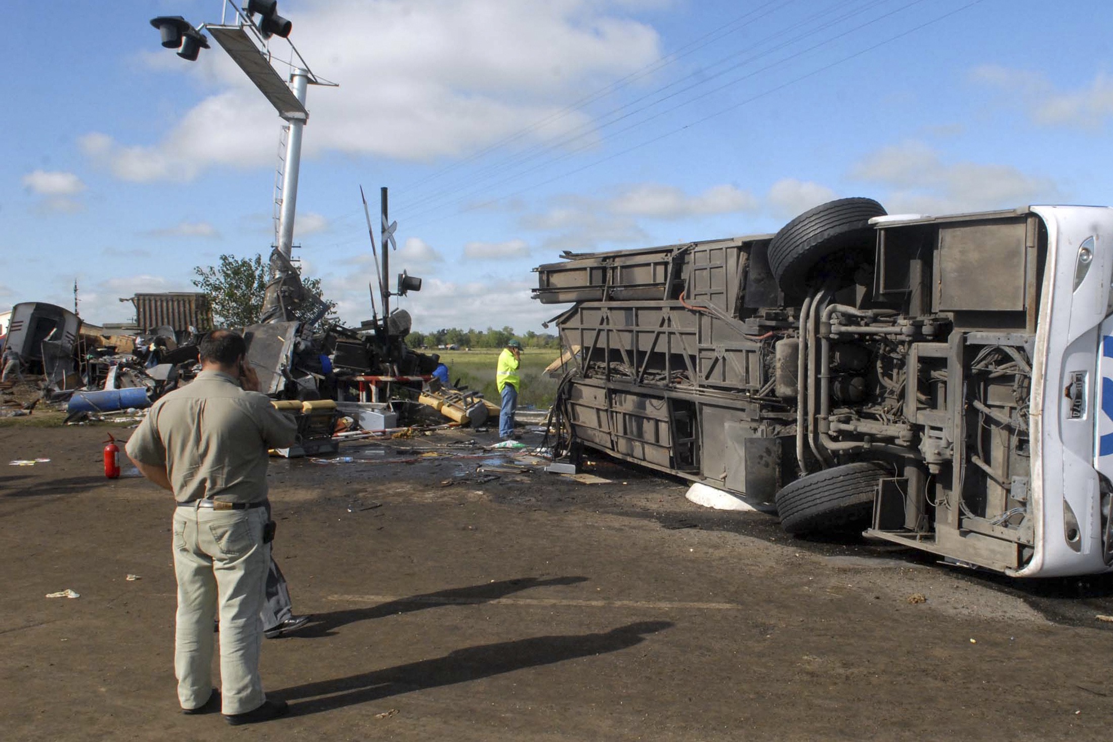 People talk on their phones while inspecting the wreckage at the rail crossing where a passenger train crashed into a bus in Dolores, Buenos Aires province March 9, 2008. A train crashed into a bus in Argentina early on Sunday, killing 18 people and injuring about 45, local media reported. "It seems the driver of the bus passed when the barrier was down and the train cut the bus in half," Daniel Scioli, the provincial governor, told local television at the crash scene. [Agencies] |