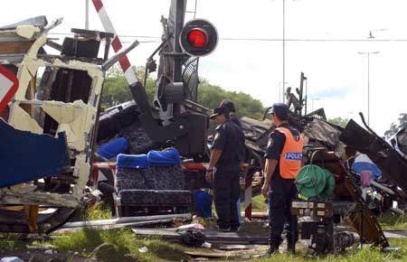 Firemen walk near the rail crossing where a passenger train crashed into a bus in Dolores, Buenos Aires province March 9, 2008. The death toll in a massive train-bus collision Sunday in southwest Argentina has climbed to 26, with 60 people injured, local police said. [Agencies]