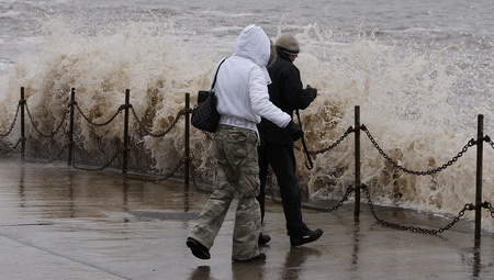 A couple avoid waves as they walk on the near Blackpool, northern England, March 10, 2008. A storm rushing in from the Atlantic lashed the south west on Monday with winds and tide bringing the risk of coastal flooding. [Agencies]