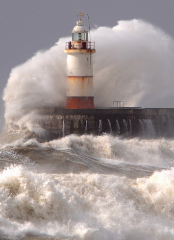 Stormy seas hit coastal sea defences and a lighthouse at Seaford in Sussex in southern England March 10, 2008. A storm rushing in from the Atlantic lashed the south west on Monday with winds and tide bringing the risk of coastal flooding. [Agencies]