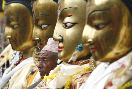 A man stands between statues of Buddha at Patan in Kathmandu during the Samyak festival March 11, 2008. This Buddhist festival is celebrated once in five years with Buddha idols brought in from several areas for worship. [Agencies]