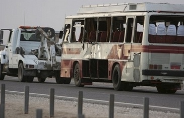 A bus that was hit by a roadside bomb is towed away near Nasiriyah, about 320 kilometers (200 miles) southeast of Baghdad, Iraq, Tuesday, March, 11, 2008. At least 16 civilians aboard died and another 22 were wounded in the blast. [Agencies]