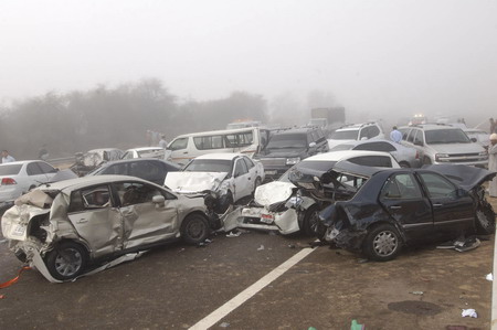 Damaged vehicles are seen after a pile-up during morning rush hour on the main motorway between Dubai and Abu Dhabi in the Ghantout area March 11, 2008. Three people were killed and 277 injured in the United Arab Emirates on Tuesday when dozens of cars and buses collided in thick fog in what could be the country's biggest traffic accident, police said. [Agencies]