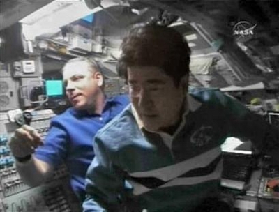 Japan Aerospace Exploration Agency astronaut Takao Doi (R) works on the aft flight deck of the Space Shuttle Endeavour with Pilot Gregory Johnson in this image from NASA TV March 11, 2008. [Agencies]