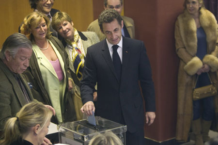 France's President Nicolas Sarkozy (C) votes in the second round municipal elections in Paris on March 16, 2008. France goes to the polls for the final round of municipal elections which could leave the left in charge of most major French cities and put pressure on Sarkozy to change his style of government. [Agencies]