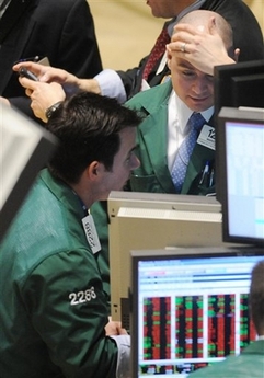 Bond prices surged as investors rushed for quality. The yield on the benchmark 10-year Treasury note, which move opposite its price, fell to 3.34 percent from 3.44 percent late Friday. The dollar was lower against other major currencies, while gold prices jumped.