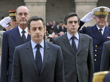 France's President Nicolas Sarkozy (front), former president Jacques Chirac (L, rear) and Prime Minister Francois Fillon (2nd L) pay tribute to the dead of World War One in a state funeral for Lazare Ponticelli, aged 110, its last surviving WWI veteran, at a ceremony at the Invalides in Paris March 17, 2008. Ponticelli, an Italian immigrant who joined the Foreign Legion as a 16 year-old at the outbreak of the war with Germany in 1914, died last week. [Agencies]