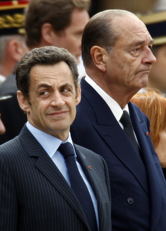 France's President Nicolas Sarkozy (L) stands with former president Jacques Chirac at a ceremony to pay tribute to the dead of World War One during a state funeral for Lazare Ponticelli, aged 110, France's last surviving WWI veteran, at the Invalides in Paris, March 17, 2008. Ponticelli, an Italian immigrant who joined the Foreign Legion as a 16 year-old at the outbreak of the war with Germany in 1914, died last week. [Agencies]