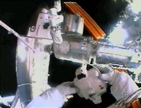 Spacewalker Rick Linnehan's helmet camera provides a view of the Endeavour docked with the International Space Station as he prepares to take a picture during a spacewalk in this image from NASA TV March 17, 2008. [Agencies]