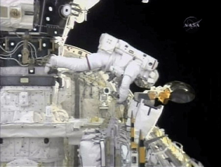 Spacewalker Rick Linnehan is lowered into Endeavour's cargo pay while attached to the space shuttle's Endeavour's robot arm in this image from NASA TV March 17, 2008. [Agencies]
