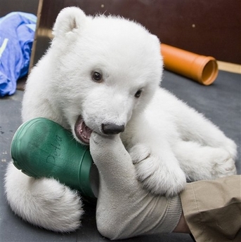 In this photo released by the 'Tiergarten Nuernberg' zoo in Nuremberg on Monday March 17, 2008, polar bear cub Flocke is seen nibbling on her keeper, Petra's foot. [Agencies]