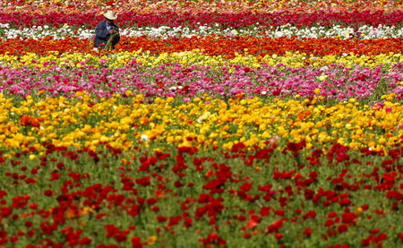 A worker picks Ranunculi flowers at a commercial flower growing field in Carlsbad, California March 18, 2008. Carlsbad, located between Los Angeles and San Diego, is a major commercial flower-growing center in California. The flower fields bloom annually during March and April. [Agencies]