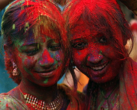 Women pose after applying coloured powder to each other as they celebrate Basanta Utsab or Spring Festival in the eastern Indian city of Kolkata March 19, 2008. [Agencies]