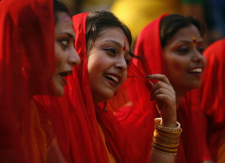 Women watch a dance as they celebrate Basanta Utsab or Spring Festival in the eastern Indian city of Kolkata March 19, 2008. [Agencies]