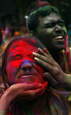 Coloured powder is applied to people during the celebration of Basanta Utsab or Spring Festival in the eastern Indian city of Kolkata March 19, 2008. [Agencies]