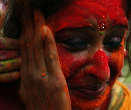 Coloured powder is applied to a woman during the celebration of Basanta Utsab or Spring Festival in the eastern Indian city of Kolkata March 19, 2008. [Agencies]