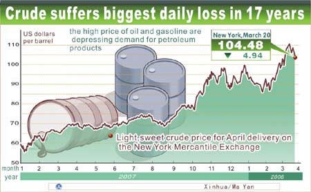 Graphics shows the price of the light, sweet crude for April delivery closes at US$104.48 a barrel on the New York Mercantile Exchange on March 19, 2008, down 4.94 dollars, the biggest daily loss in more than 17 years. [Xinhua]