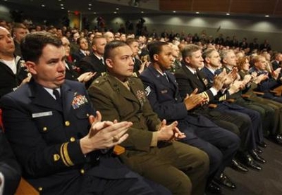 Members of the US military applaud President George W. Bush at the Pentagon, March 19, 2008. [Agencies]