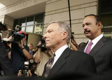 Lewis "Scooter" Libby, former Chief of Staff to US Vice President Dick Cheney, leaves the courthouse with his attorney Theodore Wells (R) after being sentenced to 30 months in prison and fined $250,000 for his role in the CIA leak case at US District Court in Washington, June 5, 2007. [Agencies]