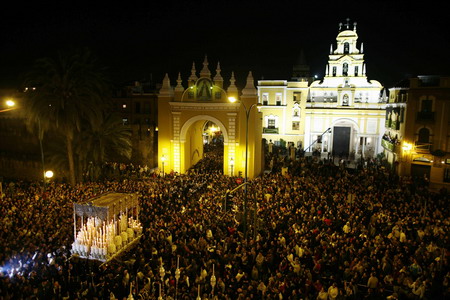 People gather to watch a procession of "La Macarena" brotherhood during Holy Week in the Andalusian capital of Seville, southern Spain March 20, 2008. Hundreds of Easter processions take place around the clock in Spain during Holy Week, drawing thousands of visitors. [Agencies]