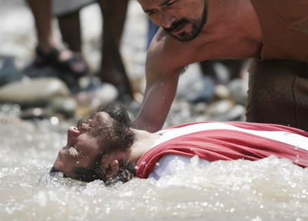 Mario Valencia, who has played the role of Jesus Christ for 26 years, is baptized during a performance in the Rimac river during the Catholic Holy Week celebrations in Lima March 20, 2008. [Agencies]