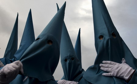 Penitents wait before taking part in the procession of "El Encuentro" brotherhood during Holy Week in the Andalusian city of Almeria, southeast Spain March 20, 2008. Hundreds of Easter processions take place around the clock in Spain during Holy Week, drawing thousands of visitors. [Agencies]