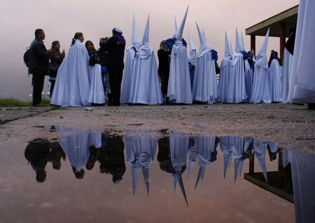 Penitents of the 'Cristo de las Tres Caidas' brotherhood wait before starting a procession during Holy Week in Algeciras, southern Spain March 20, 2008. Hundreds of Easter processions take place around the clock in Spain during Holy Week, drawing thousands of visitors. [Agencies]