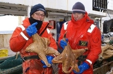 In this undated photo supplied by the National Institute of Water and Atmospheric Research, or NIWA, Benthic team members Sadie Mills, left, NIWA curatorial technician and Niki Davey, NIWA marine ecologist hold giant Macroptychaster sea star (starfish) measuring up to 60 cm across in Antarctic waters. [Agencies]