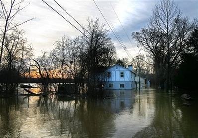 After a night of steadily rising water, the sun comes up over flooded Fenton, Mo. on Friday, March 21, 2008. The Meramec River continued to rise throughout the day and is expected to crest Saturday night. [Agencies]