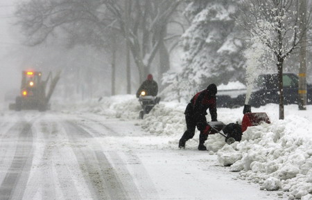 Residents in Kenosha, Wisconsin use snow blowers to clean their driveways as heavy snow falls in Southern Wisconsin and Northern Illinois March 21, 2008. [Agencies]