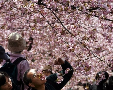 A man sniffs cherry blossoms at a park in Matsuda village, on the outskirts of Tokyo on Saturday, March 8, 2008. [Agencies]