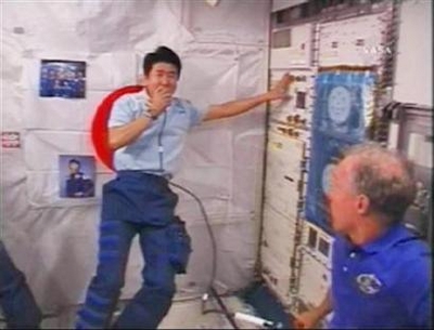 Japan Aerospace Exploration Agency astronaut Takao Doi (L) inside the new Kibo module of the International Space Station with the Japanese flag on the wall in the background as Doi gives Japanese Prime Minister Yasuo Fukuda a video tour of the new addition to the ISS as shuttle Commander Dominic Gorie (R) looks on in this image from NASA TV March 19, 2008. [Agencies]