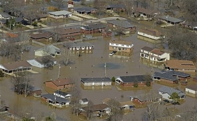 A large portion of town is covered in floodwater after a breech in the Coon Island levee Thursday, March 20, 2008 in Poplar Bluff, Missouri. With more than a dozen people killed by floodwaters and rivers still rising, weary Midwesterners on Thursday weighed not just the prospect of a sodden cleanup but the likelihood that their communities could be inundated again. [Agencies]