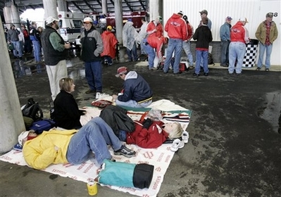 Tom Paris, front left, and Shelley Deaton, front right, both of Salem, Ind., rest as they wait under the grandstand with other race fans during a rain delay at Bristol Motor Speedway in Bristol, Tenn., Saturday, March 15, 2008. The NASCAR Nationwide Series Sharpie Mini 300 was scheduled to run Saturday afternoon. [Agencies]