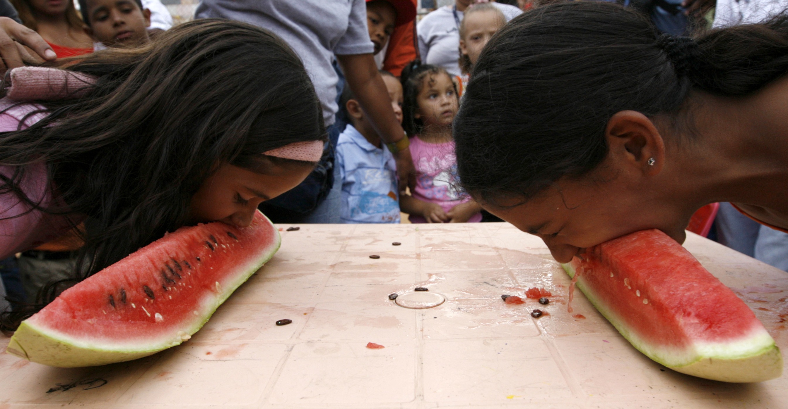 Children take part in a watermelon-eating competition during Easter Sunday celebrations in Barrio San Miguel in Caracas March 23, 2008. [Agencies] |