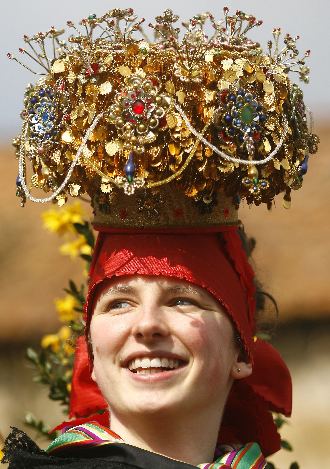 A young woman wearing a traditional Frankonian wedding hat smiles during a traditional Georgi horse riding procession on Easter Monday in the northern Bavarian village of Effeltrich, March 24, 2008. Since early 16th century farmers have taken part in the pilgrimage to bless their horses. The roots of this tradition go back to the legend of Saint George, the horsemen's patron saint. [Agencies] |