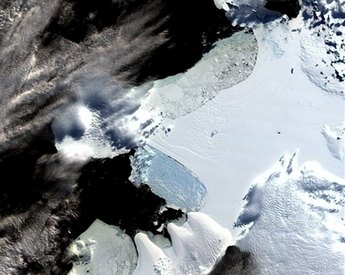 This satellite photo released by the National Snow and Ice Data Center at the University of Colorado at Boulder shows the Wilkins Ice Shelf on March 6, 2008 on the Southwest Antarctic Peninsula as it began to break apart. [Agencies]