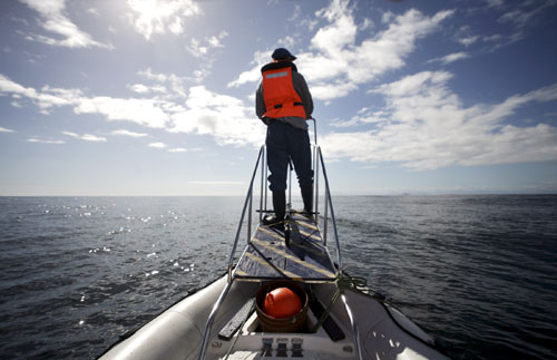 A Blue Whale Center member searches for blue whales in the El Corcovado gulf near the small island of Melinka in the Aysen region, about 1,200km (750 miles) south of Santiago, March 26, 2008. [Agencies]