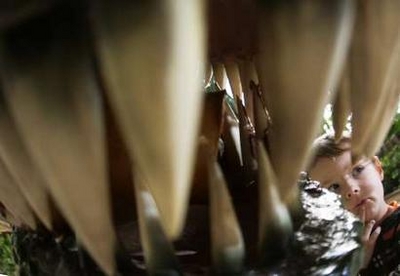 A young boy looks inside the head of a giant model of a Tyrannosaurus Rex inside a vast airship hangar hosting the Tropical Islands holiday resort, near the eastern German village of Brand, 60 kilometres (37 miles) south of Berlin February 27, 2008. Some 20 exhibits of dinosaurs will be shown from April 18, 2008 in the former hangar which houses a holiday resort with a beach. [Agencies]