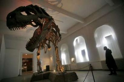 A visitor walks past a plaster model of the bones of the largest meat-eating dinosaur ever found, called the Giganotosaurus, on display at "Grigore Antipa" Museum of Natural History in Bucharest February 27, 2008. The 15-meter (45 ft.) long dinosaur is part of an exhibition called "Argentina's Dinosaurs". [Agencies]