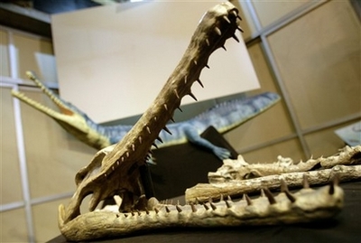 A fossil of a new prehistoric crocodile species 'Guarinisuchus munizi' is seen during a press conference at National Museum of the Rio de Janeiro Federal University in Rio de Janeiro, Wednesday, March 26, 2008. Brazilian scientists say they have found a new prehistoric crocodile species that inhabited the Earth's oceans some 62 million years ago. [Agencies]