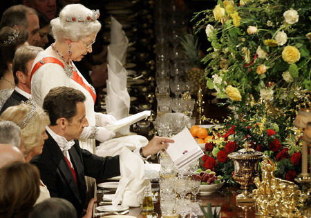 Britain's Queen Elizabeth (top) stands as she delivers a speech at the start of a state banquet for France's President Nicolas Sarkozy (C) at Windsor Castle in Windsor, near London March 26, 2008. [Agencies]