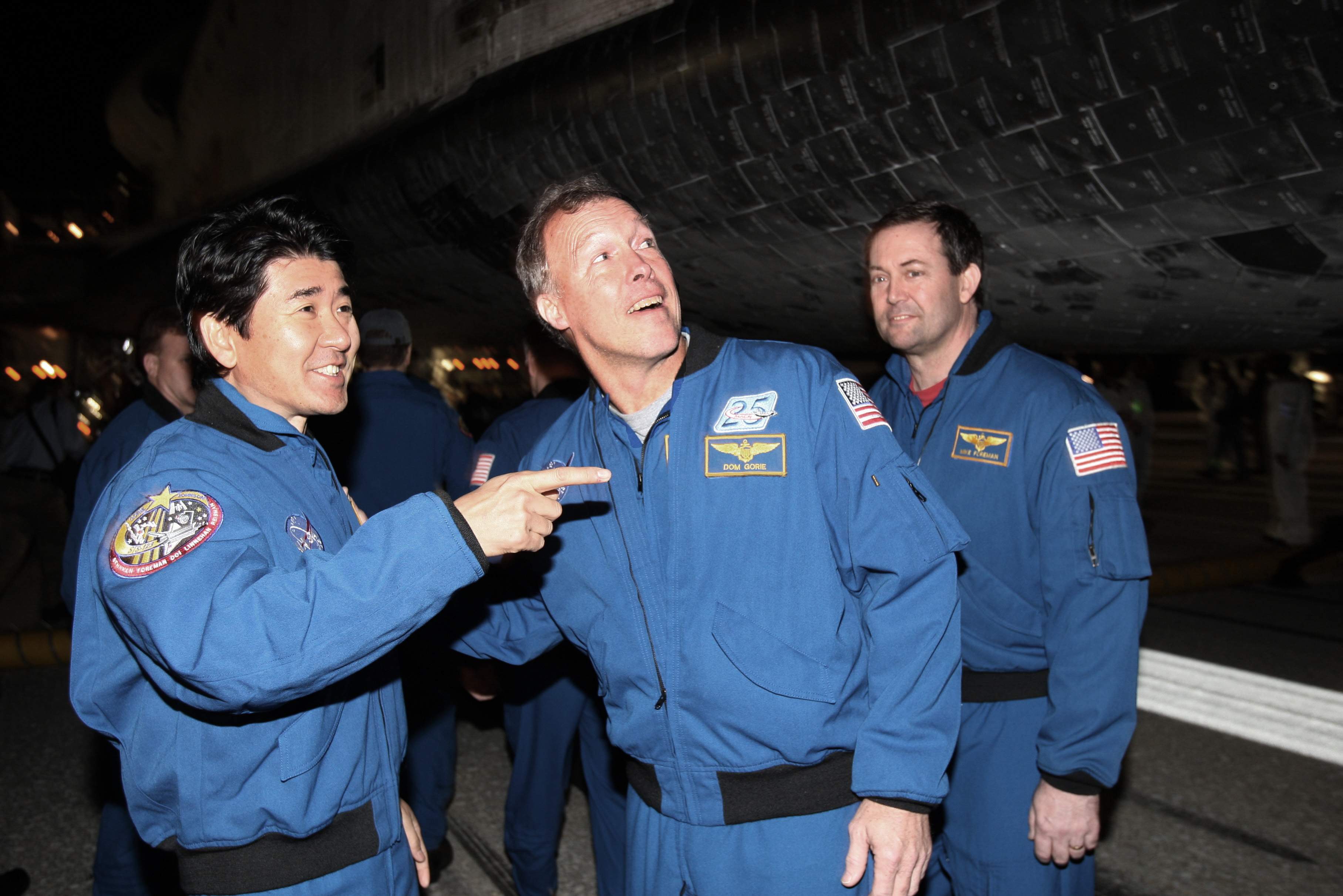 Japan Aerospace Exploration Agency's Takao Doi (L) points to the space shuttle Endeavour with mission commander Dominic Gorie and Mike Foreman (R) after it landed at the Kennedy Space Center in Cape Canaveral, Florida March 26, 2008. Endeavour ended a 16-day mission to the International Space Station. [Agencies] |