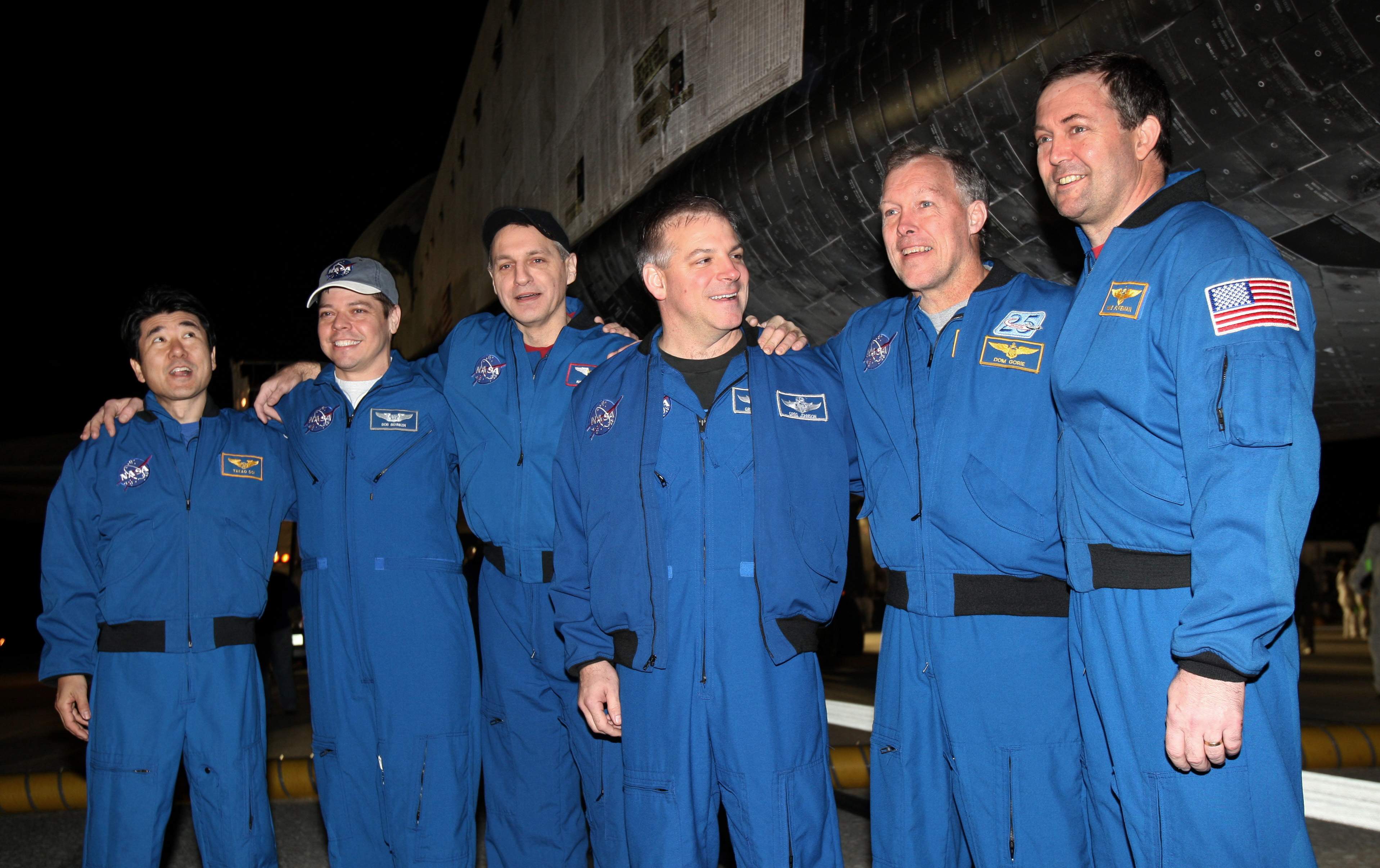 Crewmembers of the space shuttle Endeavour gather for pictures on the runway after returning to earth at the Kennedy Space Center in Cape Canaveral, Florida March 26, 2008. From left are Japan Aerospace Exploration Agency's Takao Doi, Robert Behnken, Richard Linnehan, Pilot Gregory Johnson, Commander Dominic Gorie and Michael Foreman. Endeavour ended a 16-day mission to the International Space Station. [Agencies] |